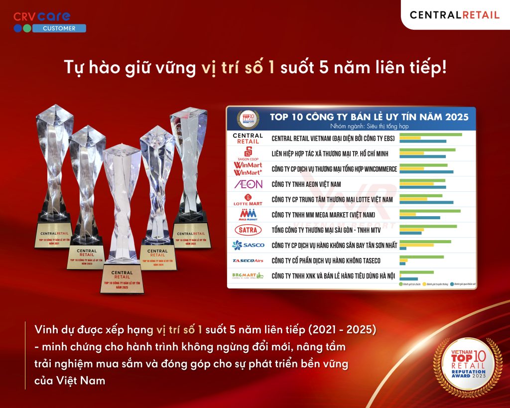 Uy tín của Central Retail trong suốt 5 năm qua được xây dựng trên nguyên tắc minh bạch, chất lượng bền vững và trách nhiệm với cộng đồng. Chúng tôi hợp tác với hơn 5.000 nhà cung cấp Việt, phân phối 150.000 tấn thực phẩm tươi sống hằng năm; cung cấp hàng ngàn sản phẩm với tiêu chí “Giá luôn luôn rẻ hơn” cùng đa dạng hàng tiêu dùng và phi thực phẩm, dịch vụ nhằm phục vụ nhu cầu của 500.000 lượt khách hàng mỗi ngày, nhờ đó, tập đoàn giữ vững được vị thế của một nhà bán lẻ hàng đầu tại Việt Nam”.