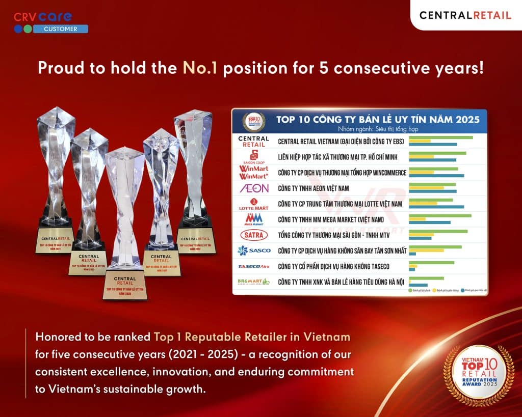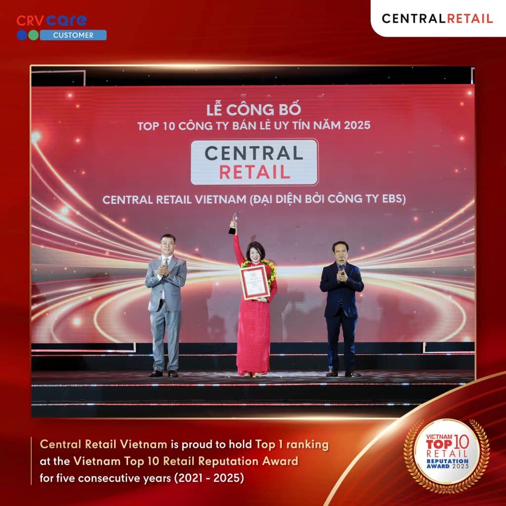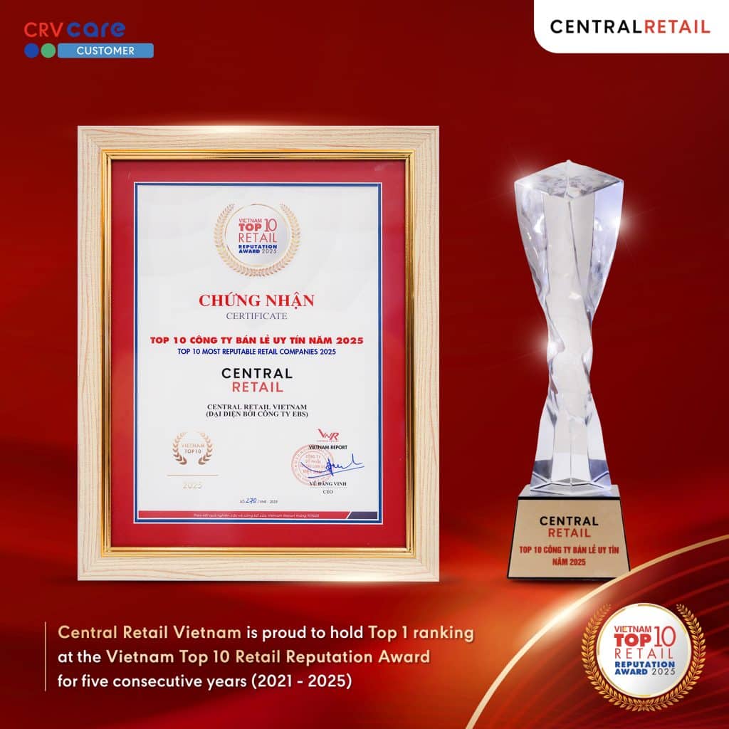 On 28 October 2025, at the National Convention Center in Hanoi, Central Retail Vietnam was honored by Vietnam Report and VietNamNet as Top 1 ranking at Vietnam Top 10 Retail Reputation Award, marking 5 consecutive years of excellence in maintaining its leading position in Vietnam’s retail industry.